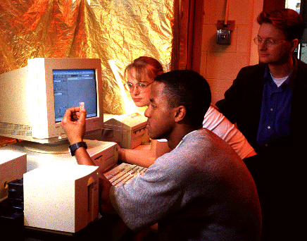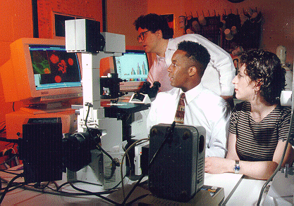 Molecular biology majors Derrick Johnson 97 and Stephanie Levi 96 are learning how to use the new CellScan system, with Associate Professor David Marcey (in back).
