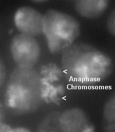DAPI-stained Drosophila Kc cells in various stages of the cell cycle. Photo was obtained by first-year biology students in a laboratory exercise entitled: "The effects of oxidants on cell proliferation".