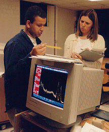 Chemistry students Devin K. Johnson 98 and Megan E. Dieterich 00 are using the Hewlett Packard 8453 Diode-Array UV/VIS Spectrophotometer to record UV spectra of sunscreen compounds, with Assistant Professor Scott Cummings.