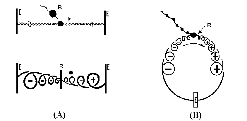 In part A, the top figure depicts the transcriptional machinery of the cell ("R") tracking along linear double-helical DNA. The "E" bars at the ends of the DNA represent either fixed points in the cellular DNA scaffold or the high viscosity of long DNA tails, both of which resist the natural relaxation of supercoiling. As the transcriptional assembly travels along the DNA, it must unwind the helix; otherwise the transcriptional machinery would need to travel around the DNA as it progressed, which would tangle transcript product around the DNA. The unwinding generates positive supercoils in front of the transcription site and negative supercoils behind it (bottom figure).