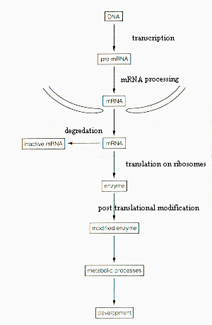 Figure 1. Possible sites of homonal control of gene activity. We can see that activation of genes represents a method of amplification that can lead to many copies of an important cellular product. Various control points in the flow of genetic information from DNA to a molecular product can be seen in figure 1. These processing steps are controlled by enzymes whose actions might be regulated by hormones.