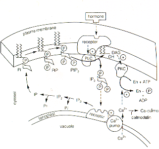 Figure 2. Model for initial hormone transduction at the plasma membrane. Binding of a hormone to its receptor causes activation (+) of nearby phospholipase c (PLC). PLC hydrolyzes a membrane lipid, phosphatidylinositol-4,5-bisphosphate (PIP2) to release inositol-1,4,5-triphosphate (IP 3)and a diacylglycerol (DAG). IP3 moves to the tonoplast in plant cells, where it combines with a receptor that activates (+) a CA