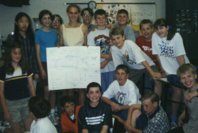 Photo 4.1: Alison Esposito, class of 2000, with some of the Mount Vernon Middle School Sixth Grade Challenge students.